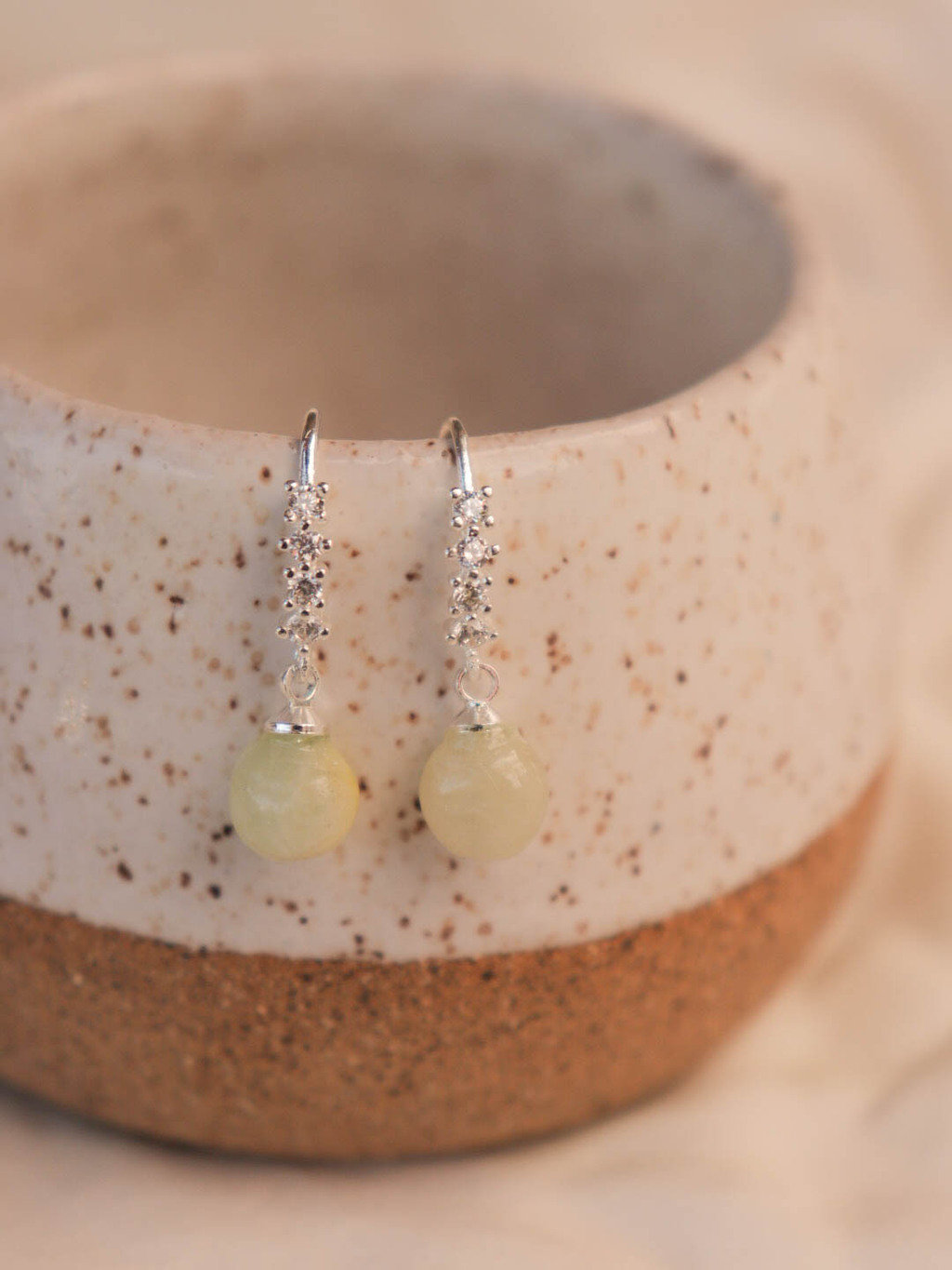 Brinco com fecho em gancho, cravejado em zircônias com uma pedra de amazonita como pingente.